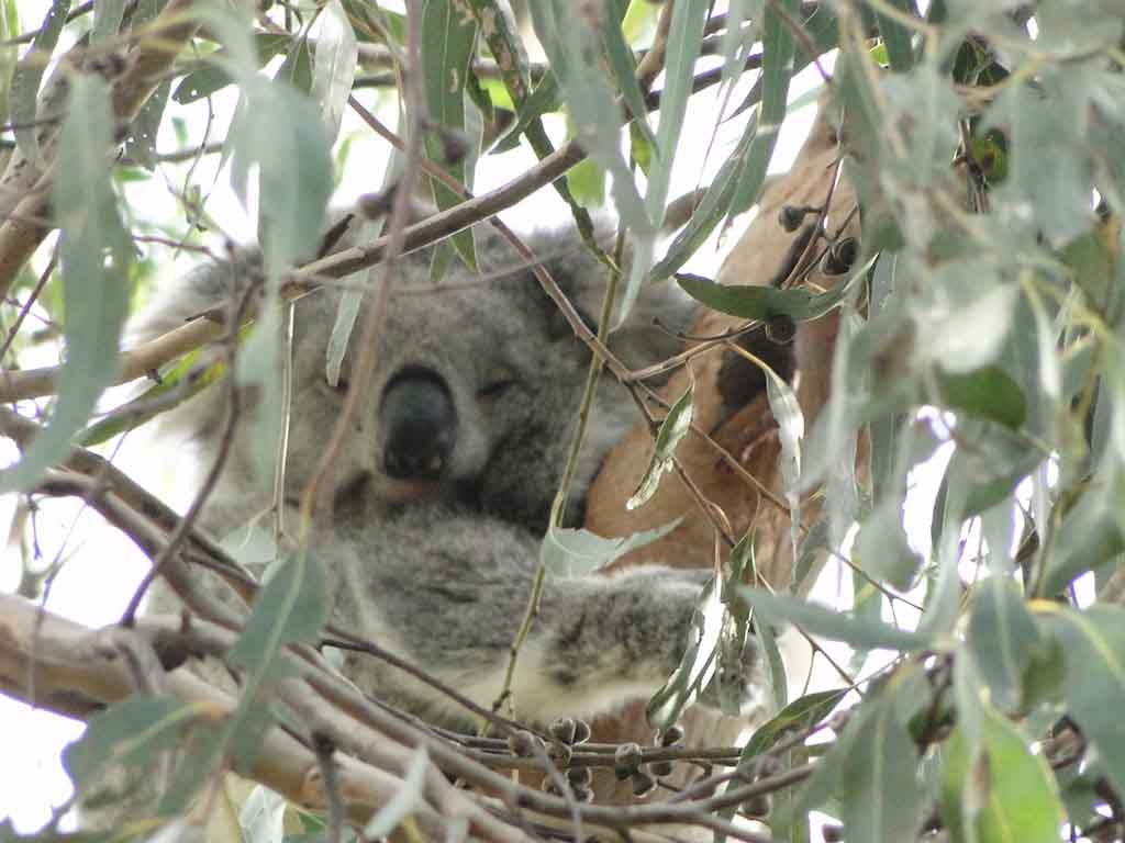 Visitamos primero el centro donde están los koalas a los que ves un poco lejos durmiendo en lo alto de lo eucaliptos. La verdad es que tienen una apariencia muy tierna… Había también un montón de razas diferentes de aves super coloristas. También podías observar “wanabis” que son muy parecidos a los canguros pero más pequeños.