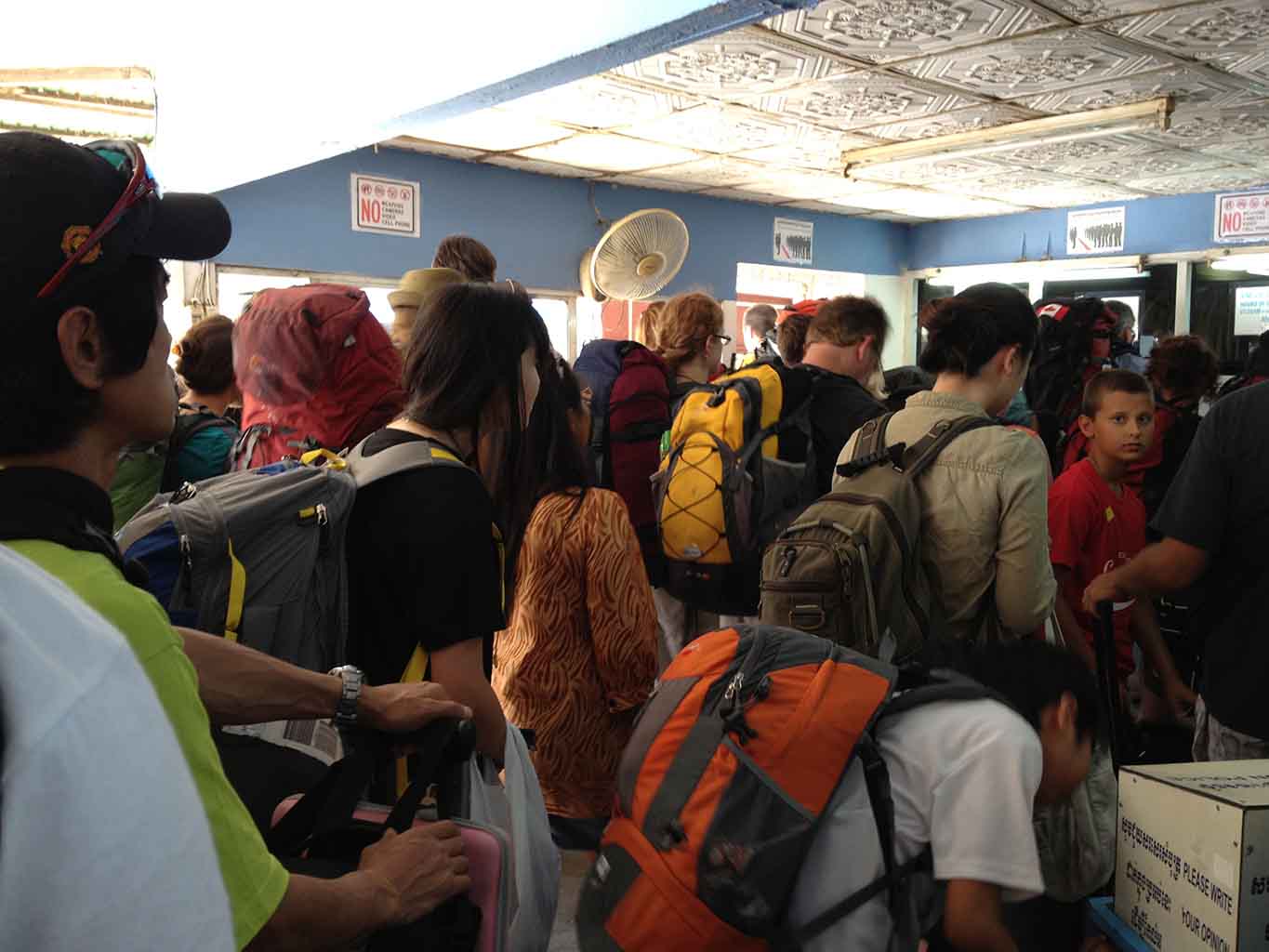 Una vez estampado el sello de salida atraviesas una «tierra de nadie»… donde hay un hotel ¿?. Y al cabo de unos 50 metros tienes el control de pasaportes para entrar en Thailandia. Aquí, por supuesto, las colas son igual de largas que en el otro lado, incluso más.