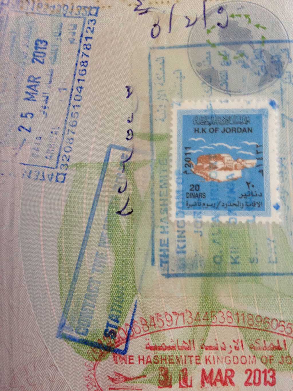 Para entrar en Jordania es necesario un visado que se puede tramitar en el aeropuerto (y en algunas puestos fronterizos, pero no está asegurado que te lo puedan dar) o desde la embajada, donde pagas más pero te ahorras las largas colas en el aeropuerto.