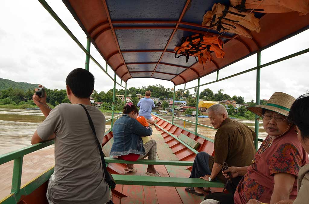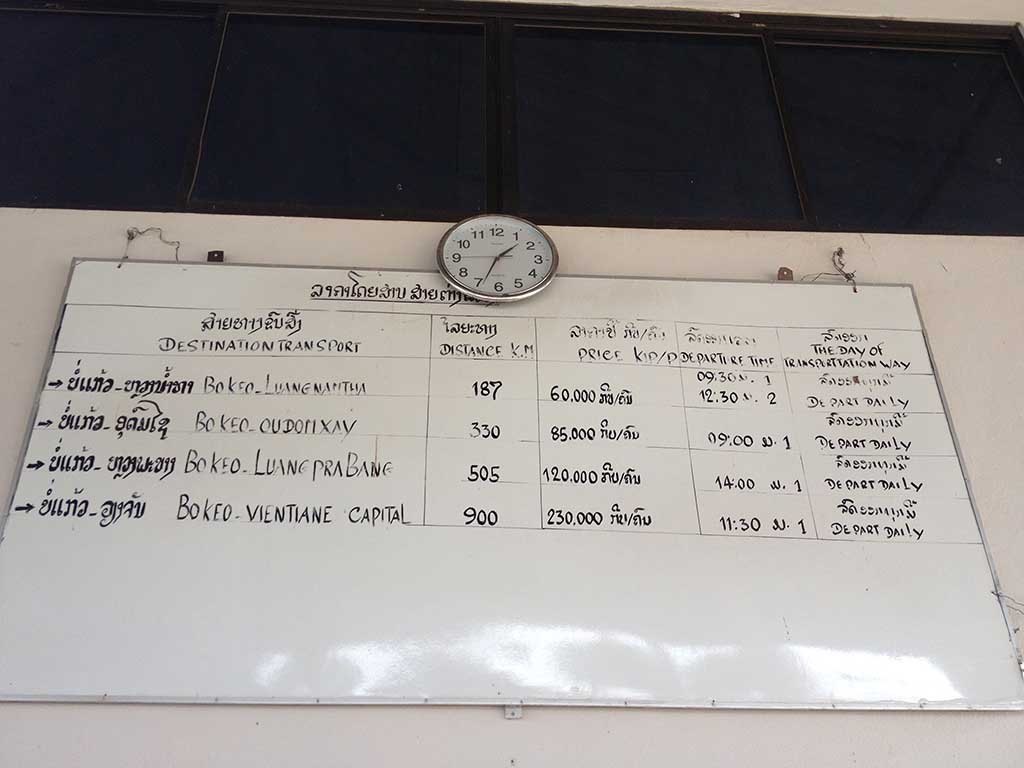 Volar hasta Chiang Rai era la forma más rápida para llegar al norte de Laos y sin que fuese muy costoso, ya que hay vuelos con Air Asia. Al llegar allí nos fuimos hasta la estación de autobuses (taxi 200 bahts = 4,7 €). Allí cogimos el bus hacia Chinag Khong que nos costó 75 bahts, casi no tuvimos que esperar nada pues hay autobuses cada hora y duran 2 h 10′. Al llegar cogimos un tuc tuc (30 bahts cada una) hasta el embarcadero donde tienes que pasar por el control policial con el pasaporte que está justo en la bajada del río. Luego, por 40 bahts, tomas la barca que te lleva a la otra orilla, a Laos.
